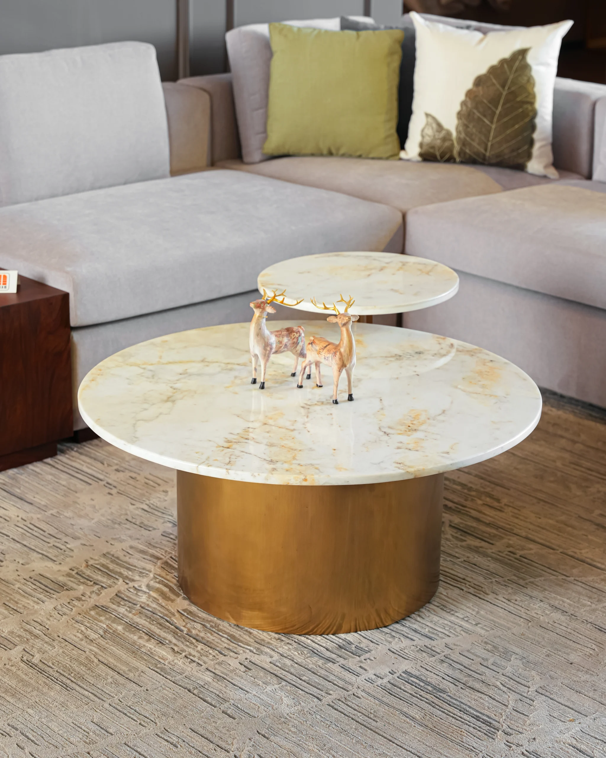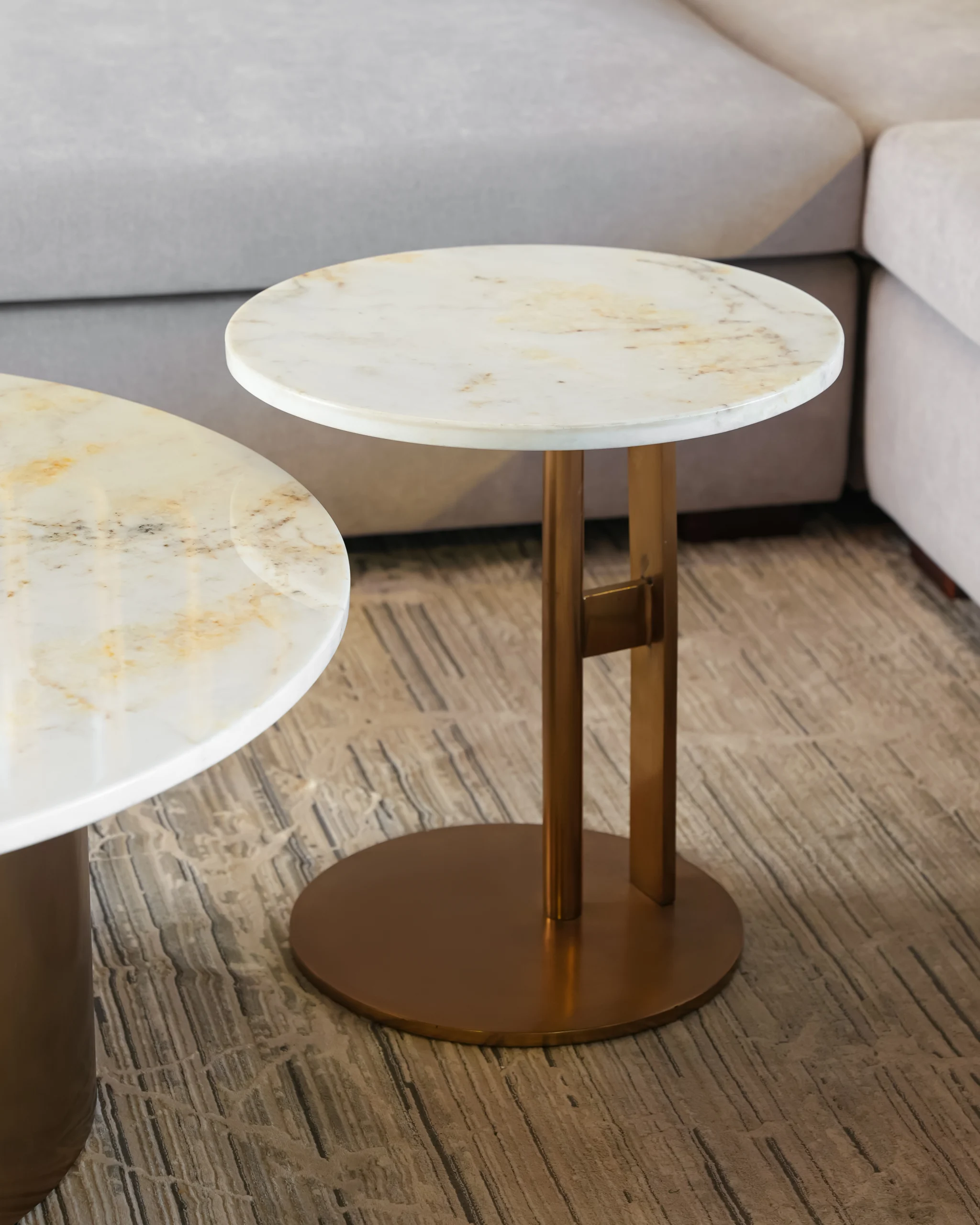 Luxurious Materials:Â Each table boasts a genuine white or cream marble top with unique natural veining, ensuring every piece is one-of-a-kind. The bases feature a rich, metallic brass finish that provides a warm, opulent contrast.