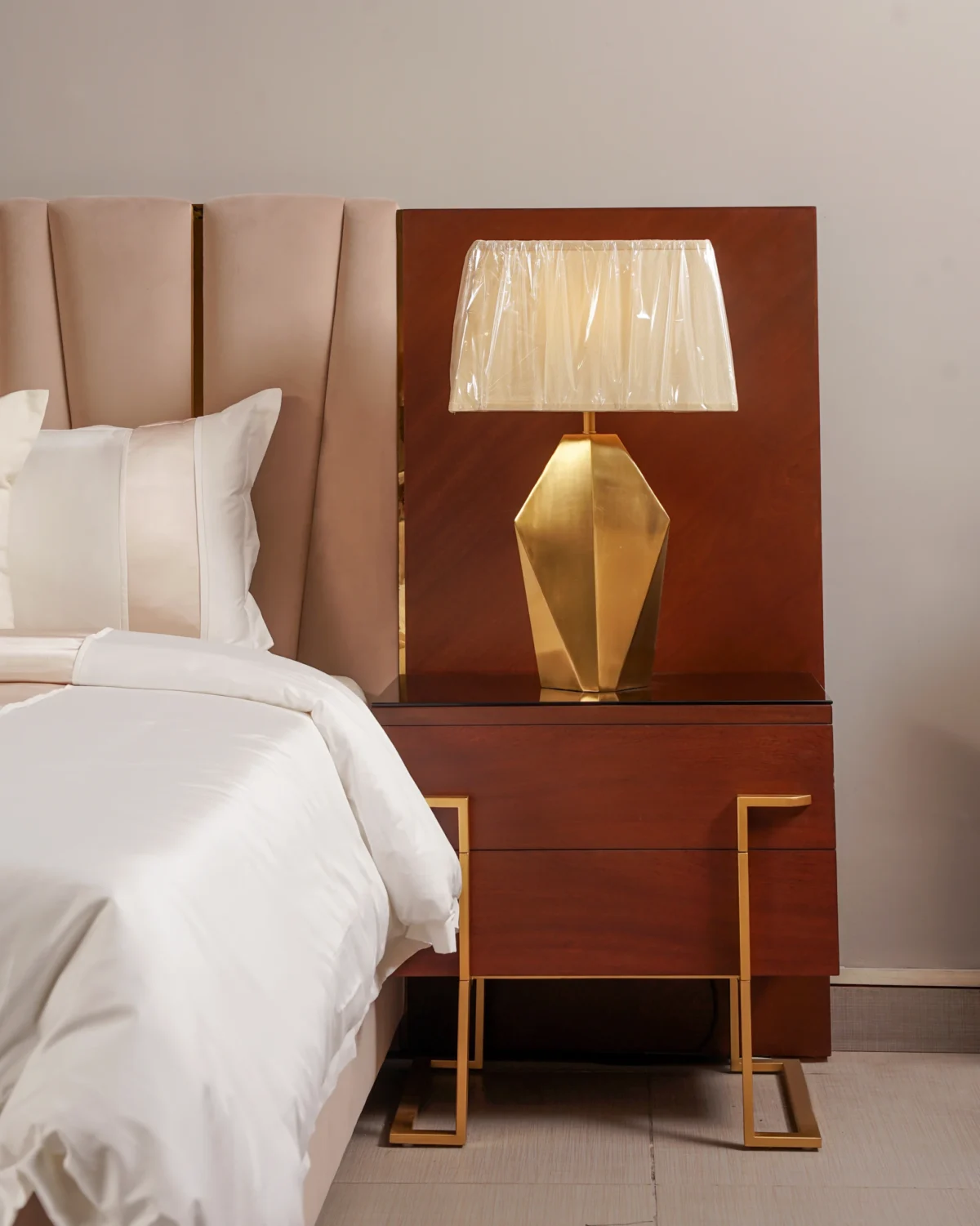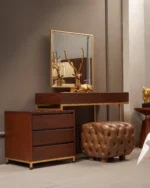 - A dressing surface with 2 drawers arranged in a single row, supported on one end by the drawer unit and on the other by a MS gold-painted leg, matching the design language of the set.