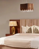The headboard stands out with randomly sized upholstered panels, creating a modern, asymmetrical design. Brass strips run alongside the upholstered sections for added sophistication.