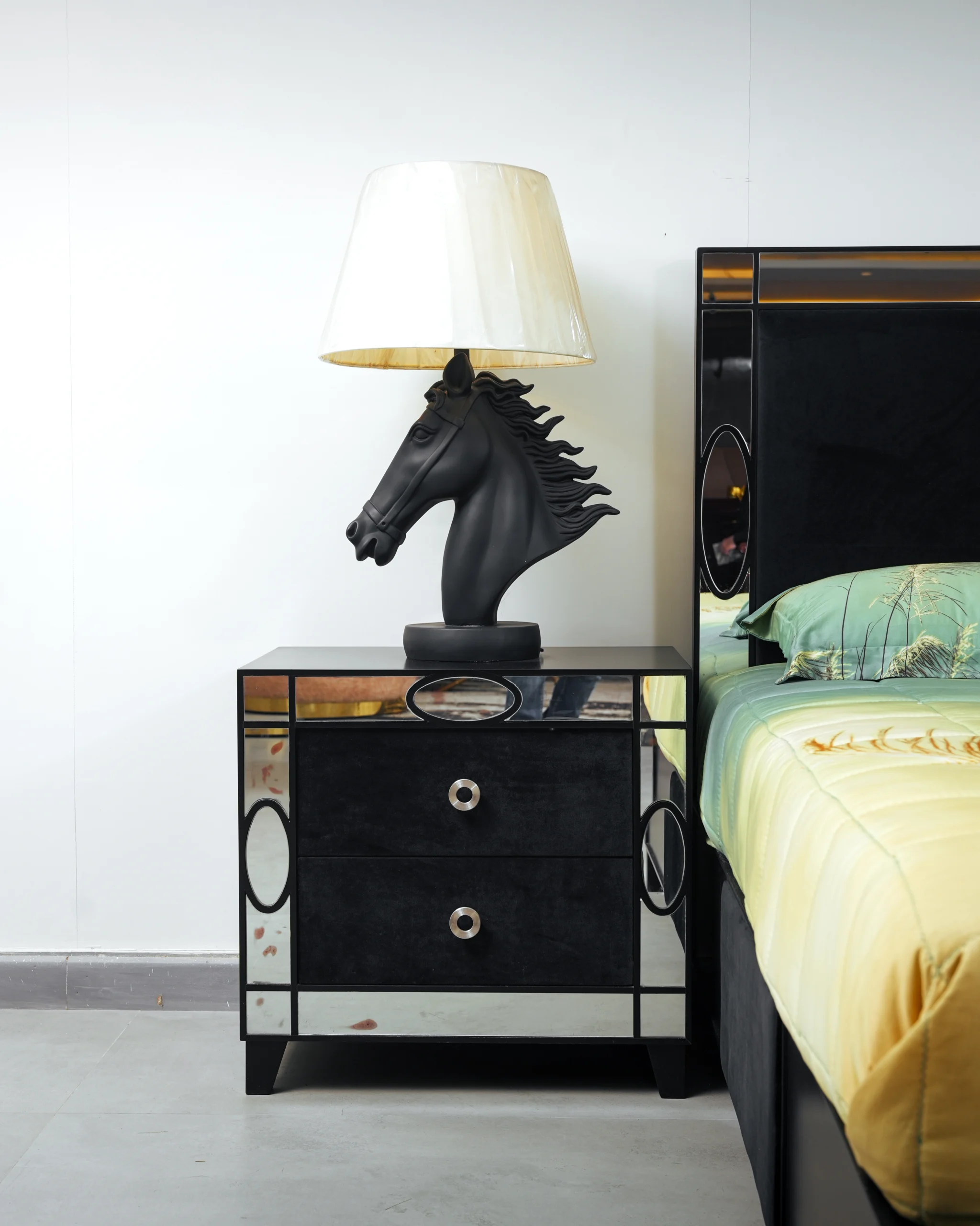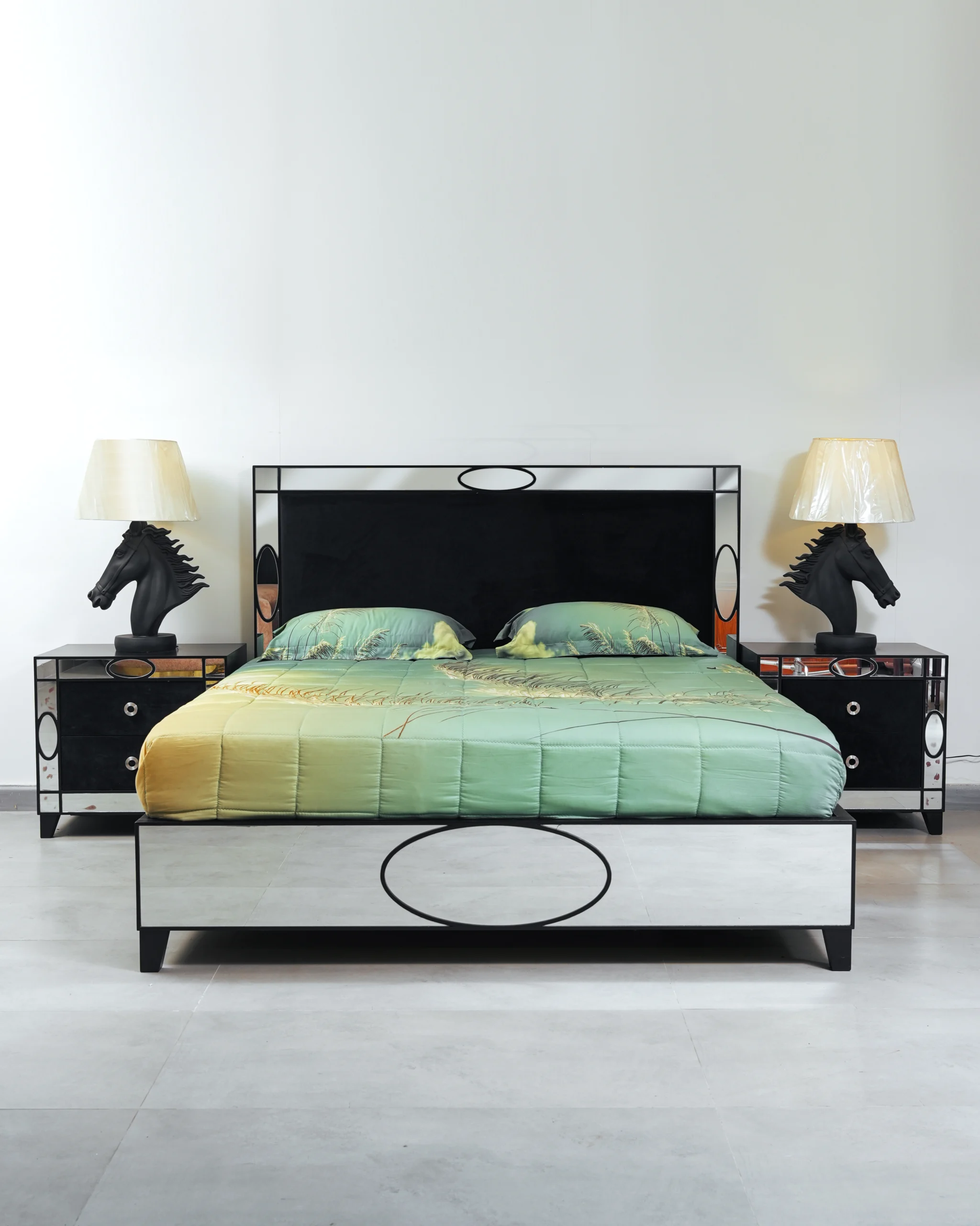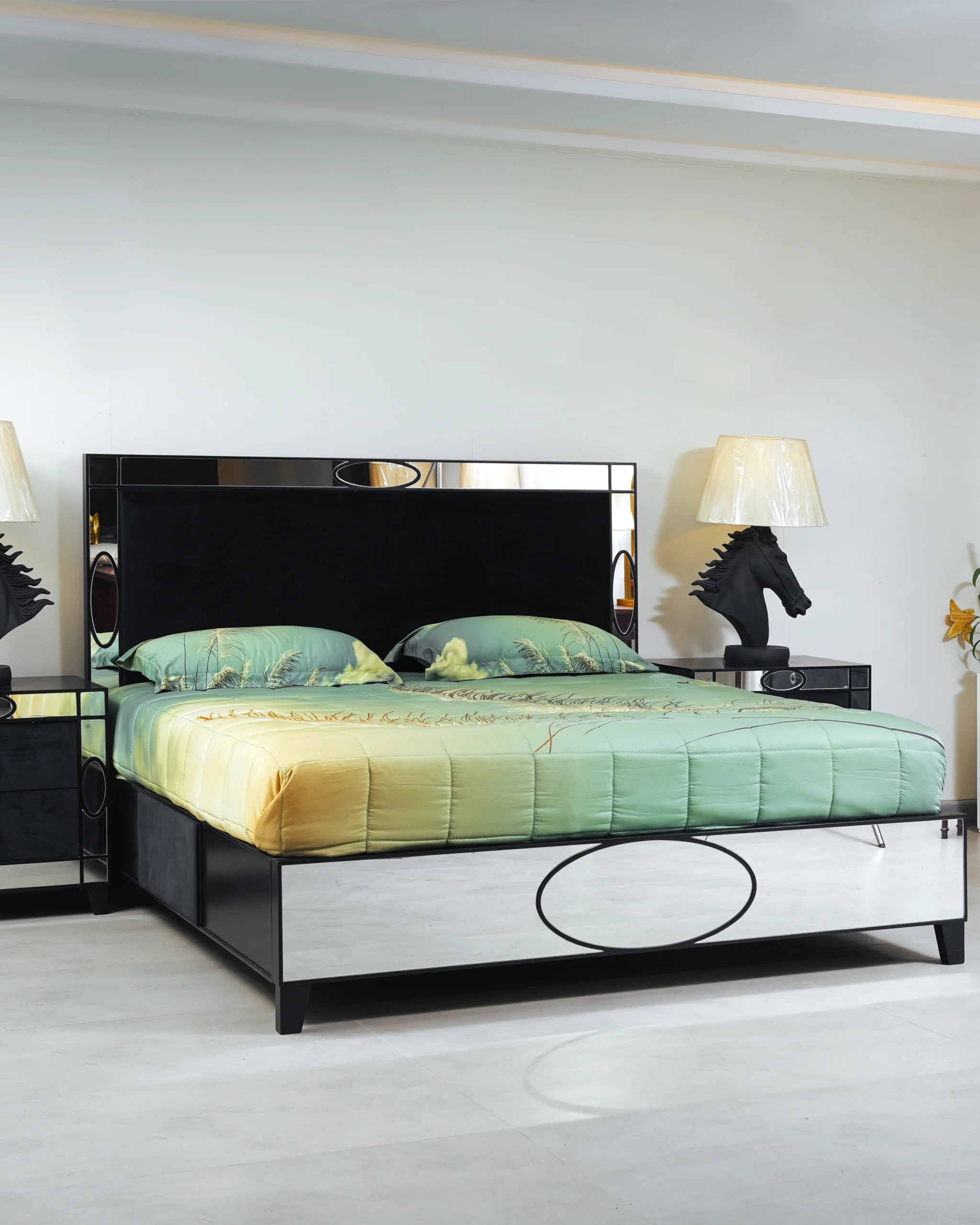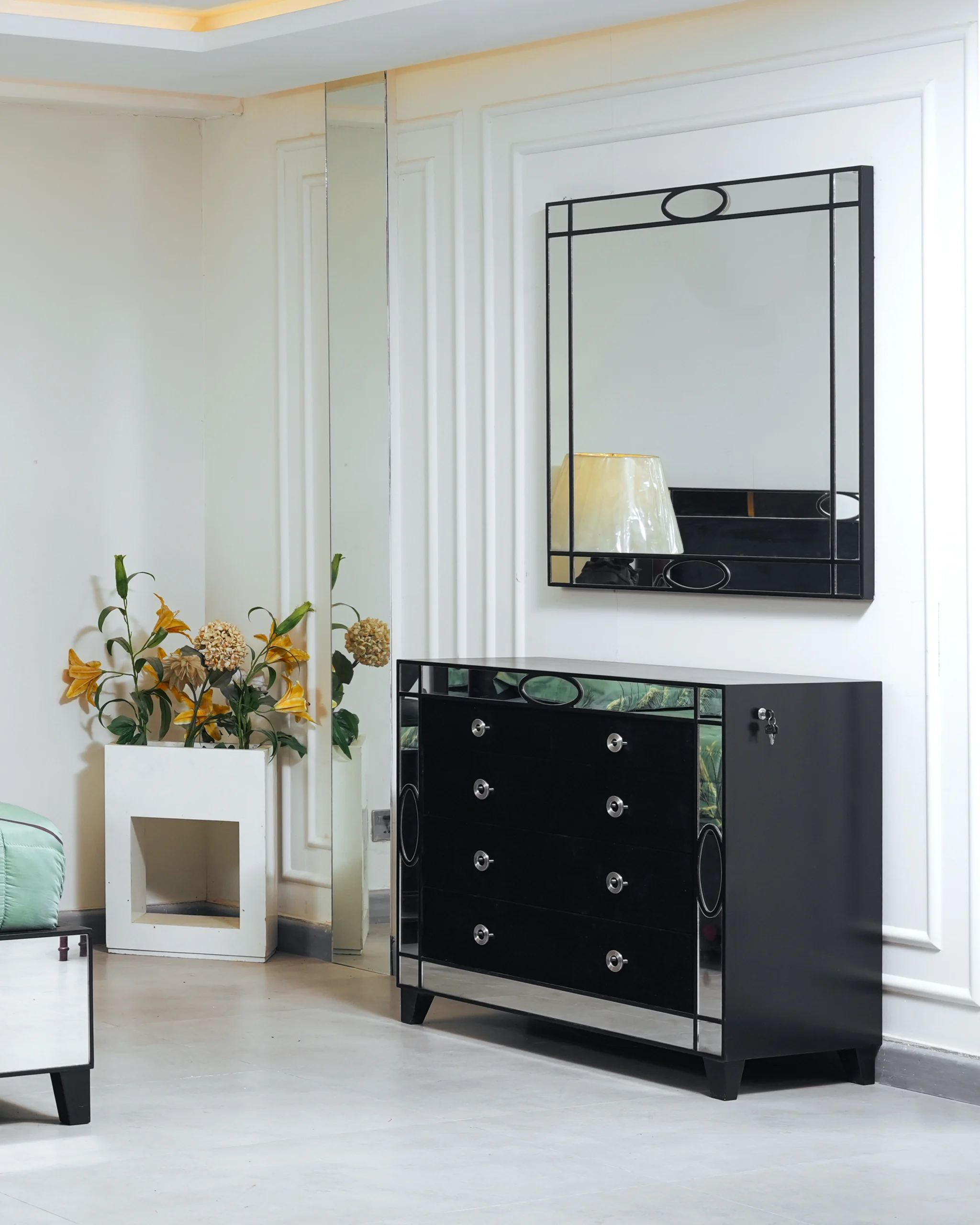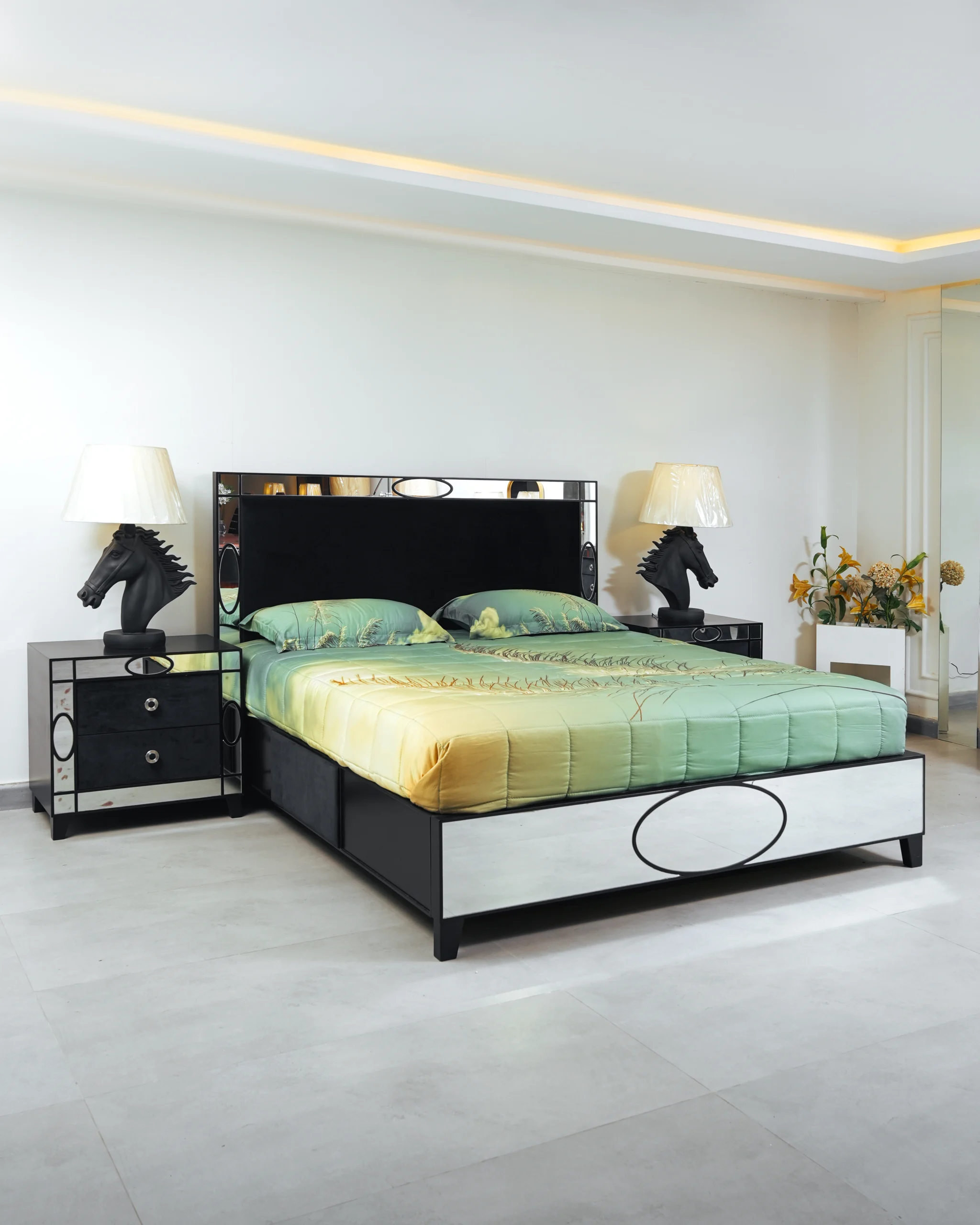 Striking Aesthetics: The collection features a high-contrast design where the deep black finish of the furniture is elegantly juxtaposed with strategically placed mirrored panels, creating an illusion of space and adding a touch of contemporary opulence.