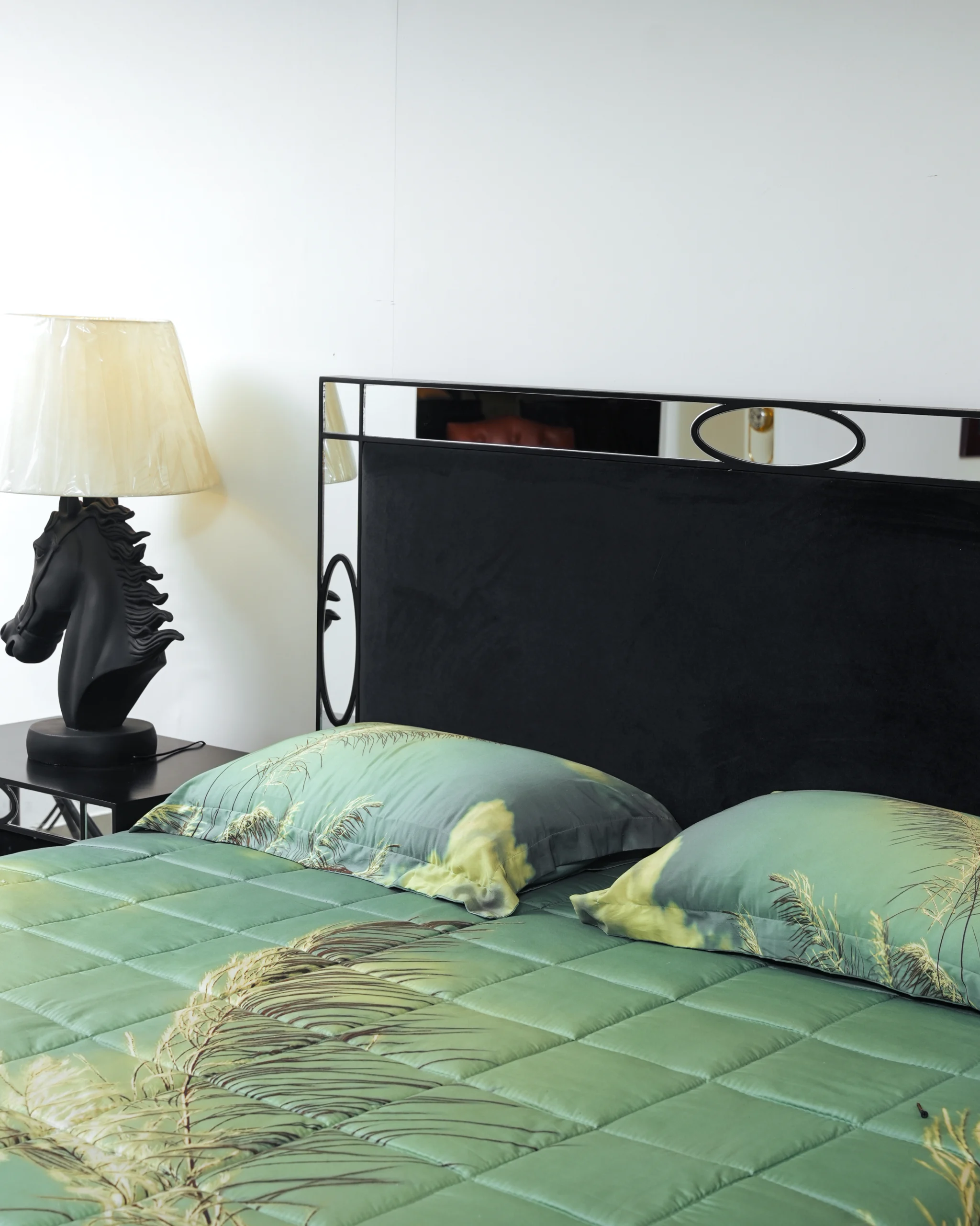 Cohesive Design: The accompanying case pieces, including the nightstands and dresser, carry the same black finish and mirrored outlines, ensuring a cohesive and polished look for your entire bedroom suite.