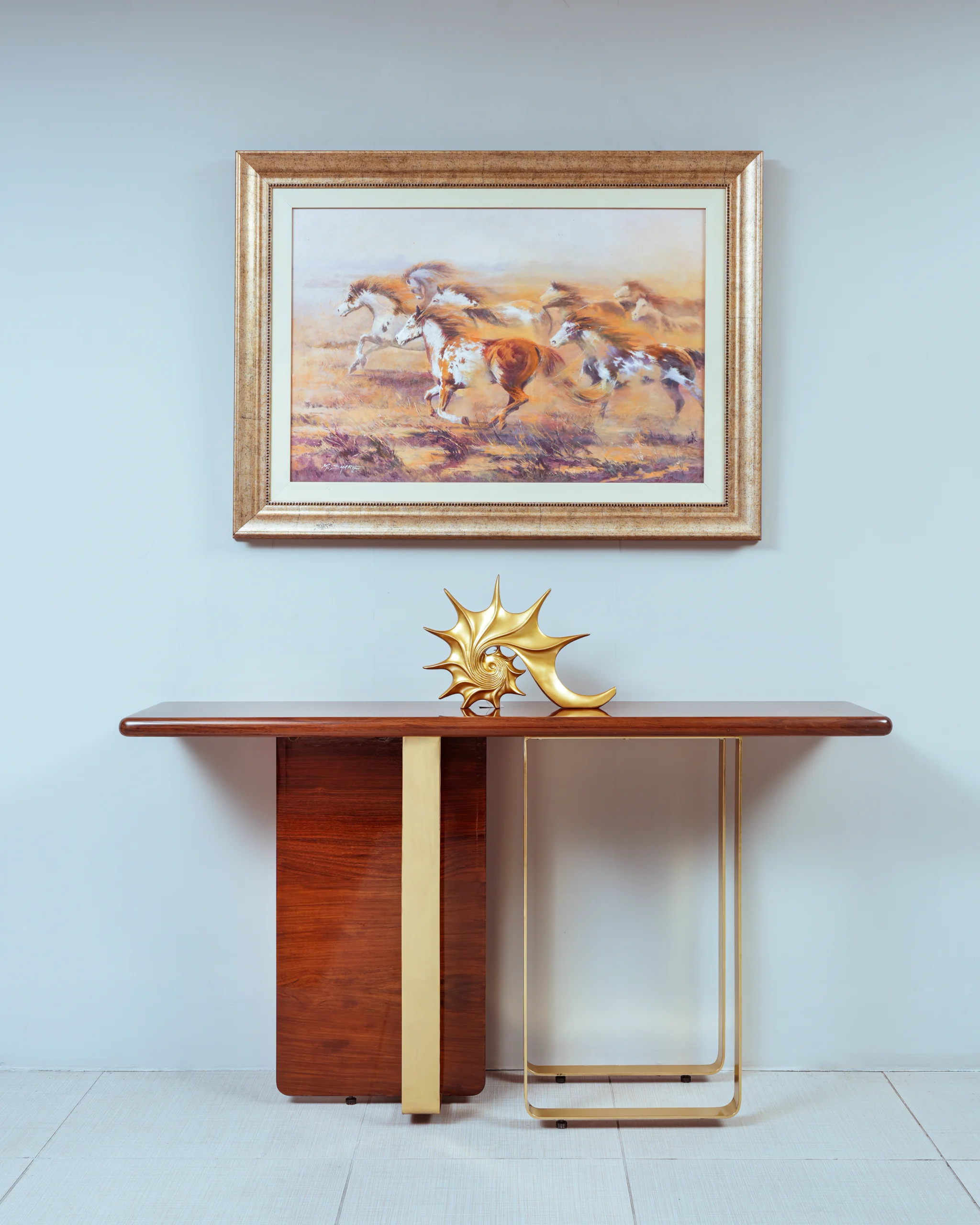 Asymmetrical Base: The console features a unique, sculptural base design. One side is anchored by the solid wood block, which is elegantly adorned with a vertical strip of polished brass. The other side is supported by a minimalist, open U-shaped brass frame, providing an airy contrast.