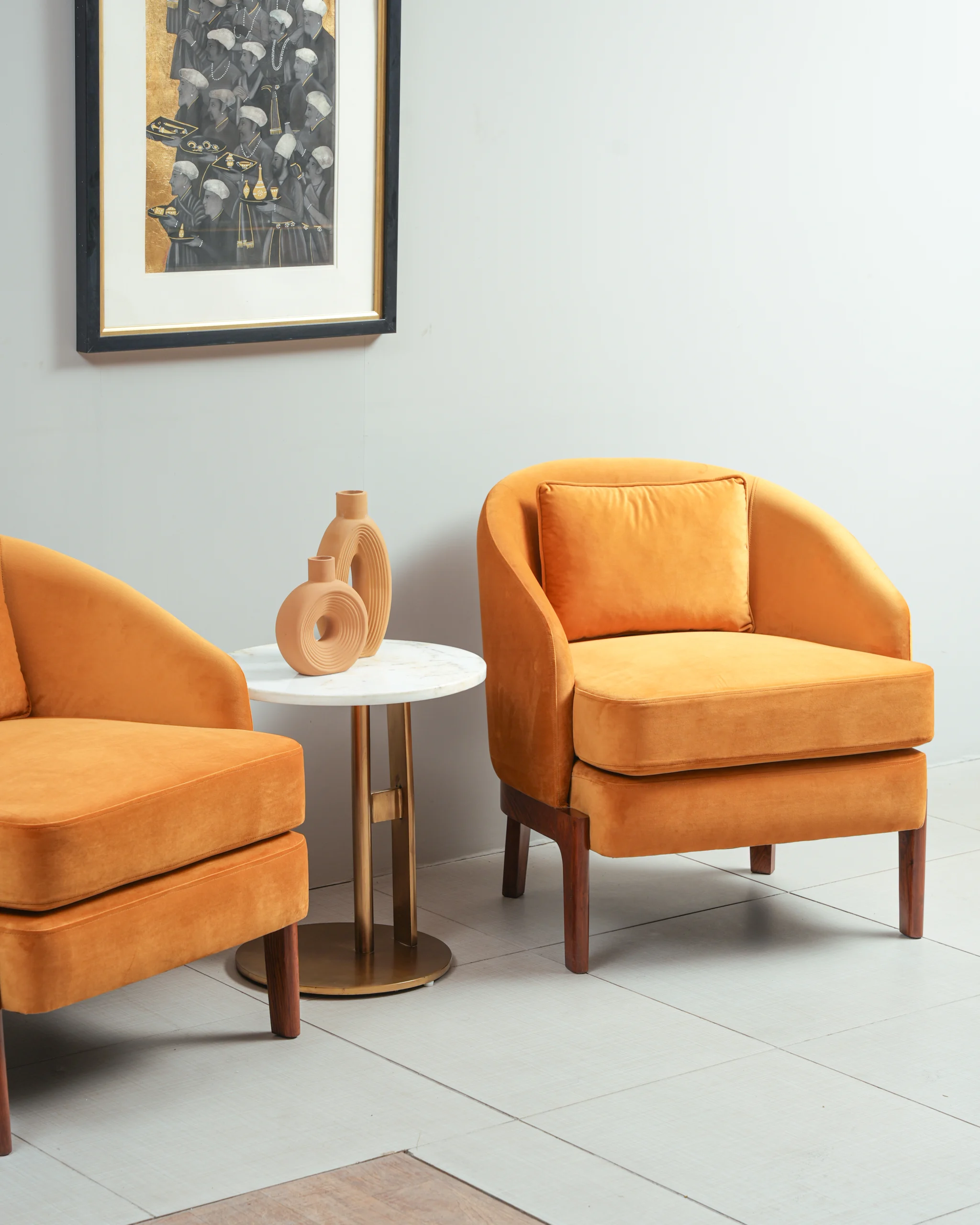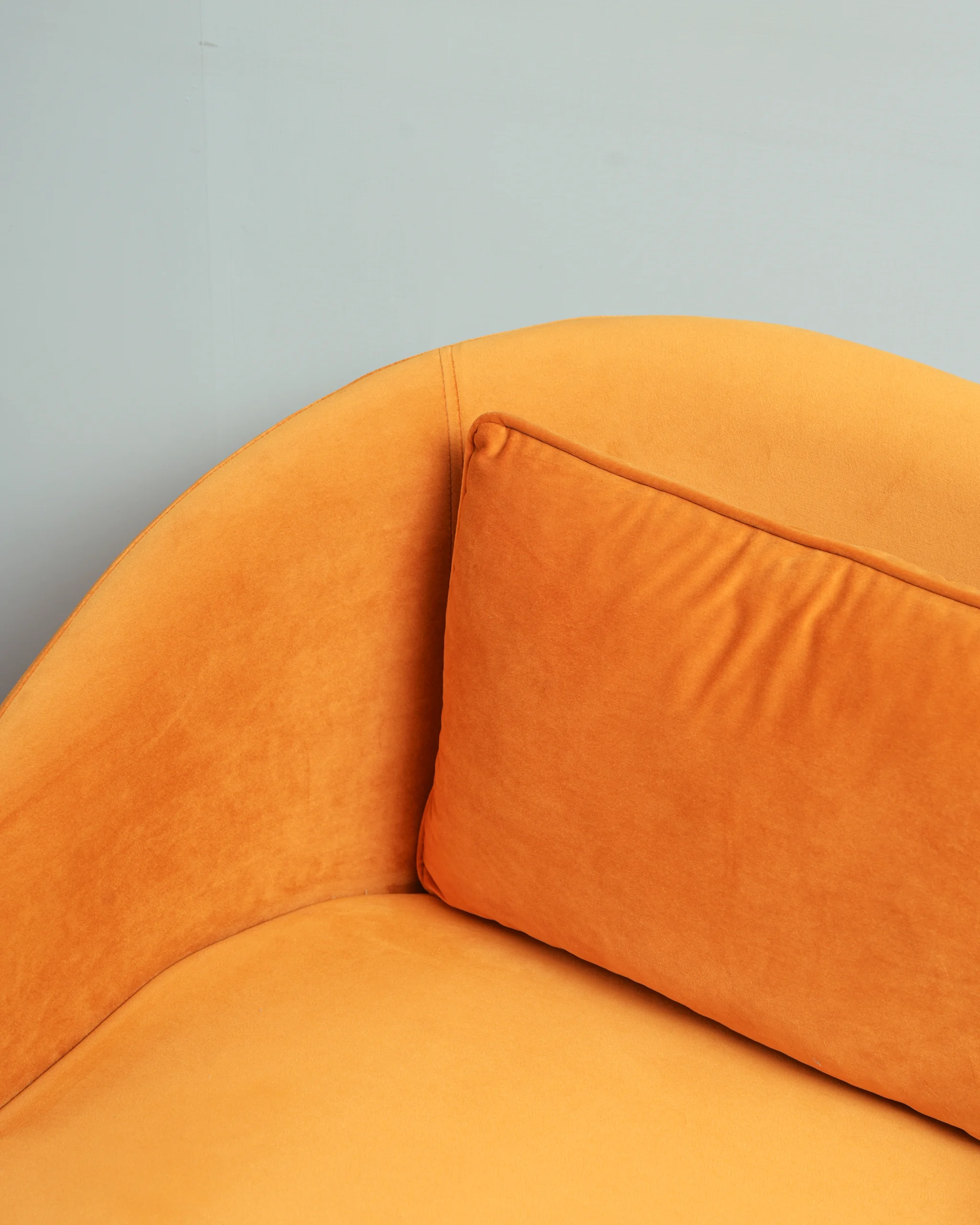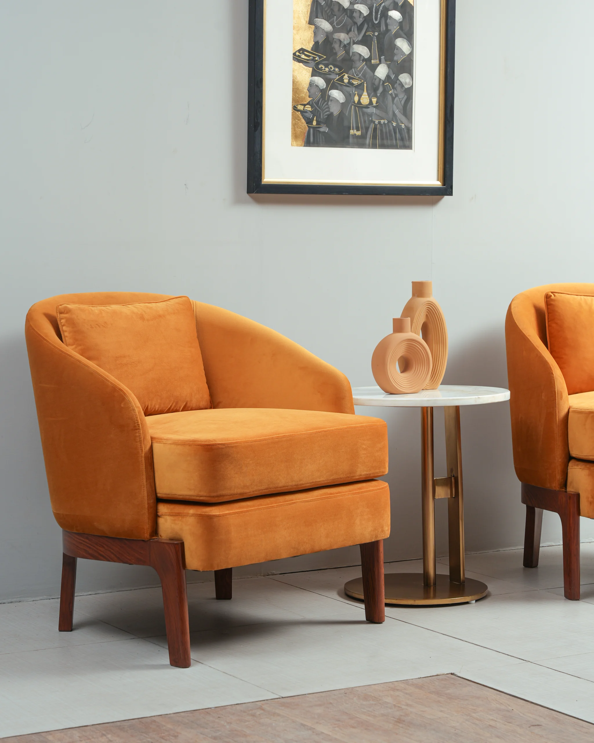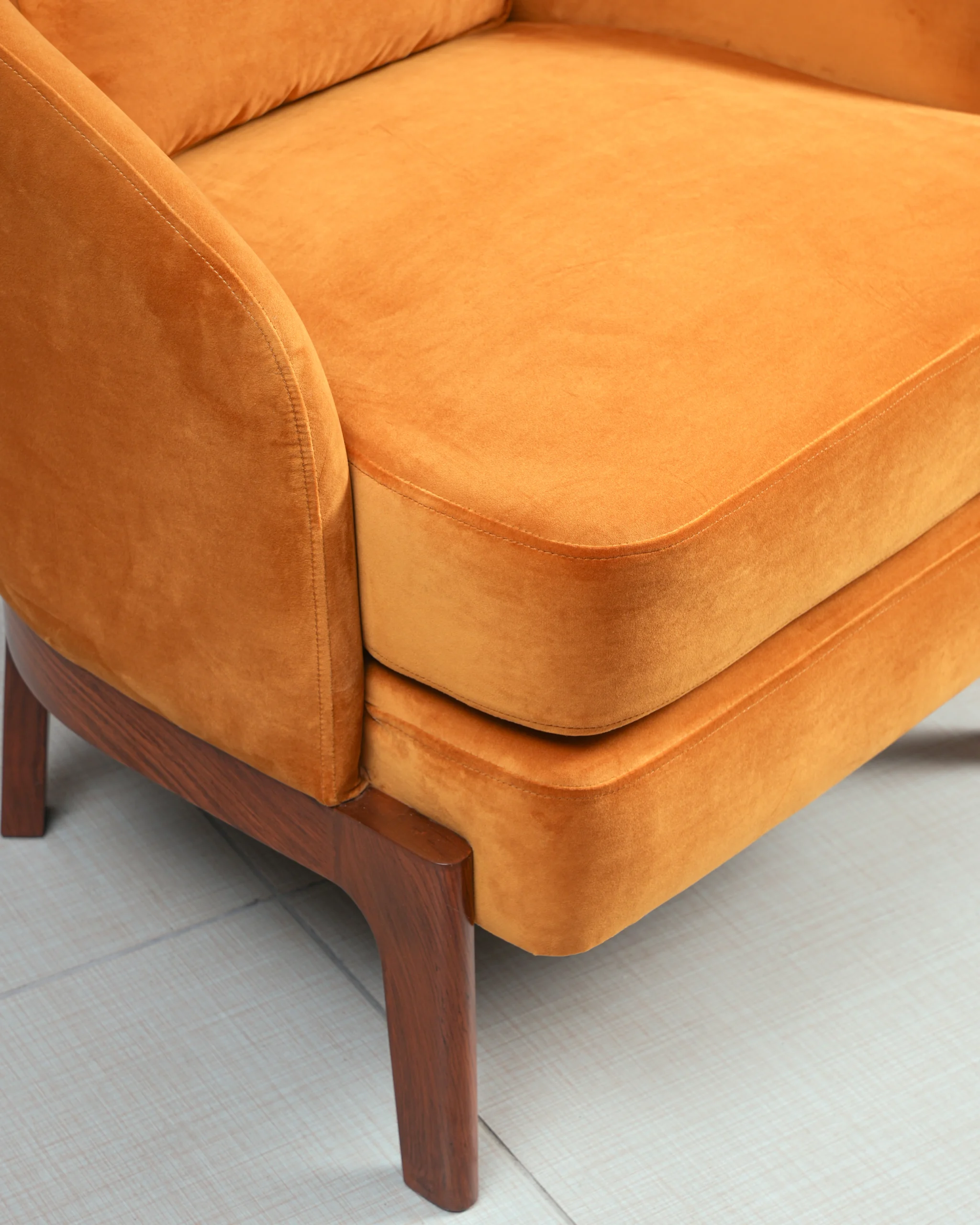 Lustrous Velvet Upholstery: The chair is upholstered in a soft, durable orange (or terracotta) velvet fabric that offers a luxurious tactile experience and a subtle sheen that shifts with the light.