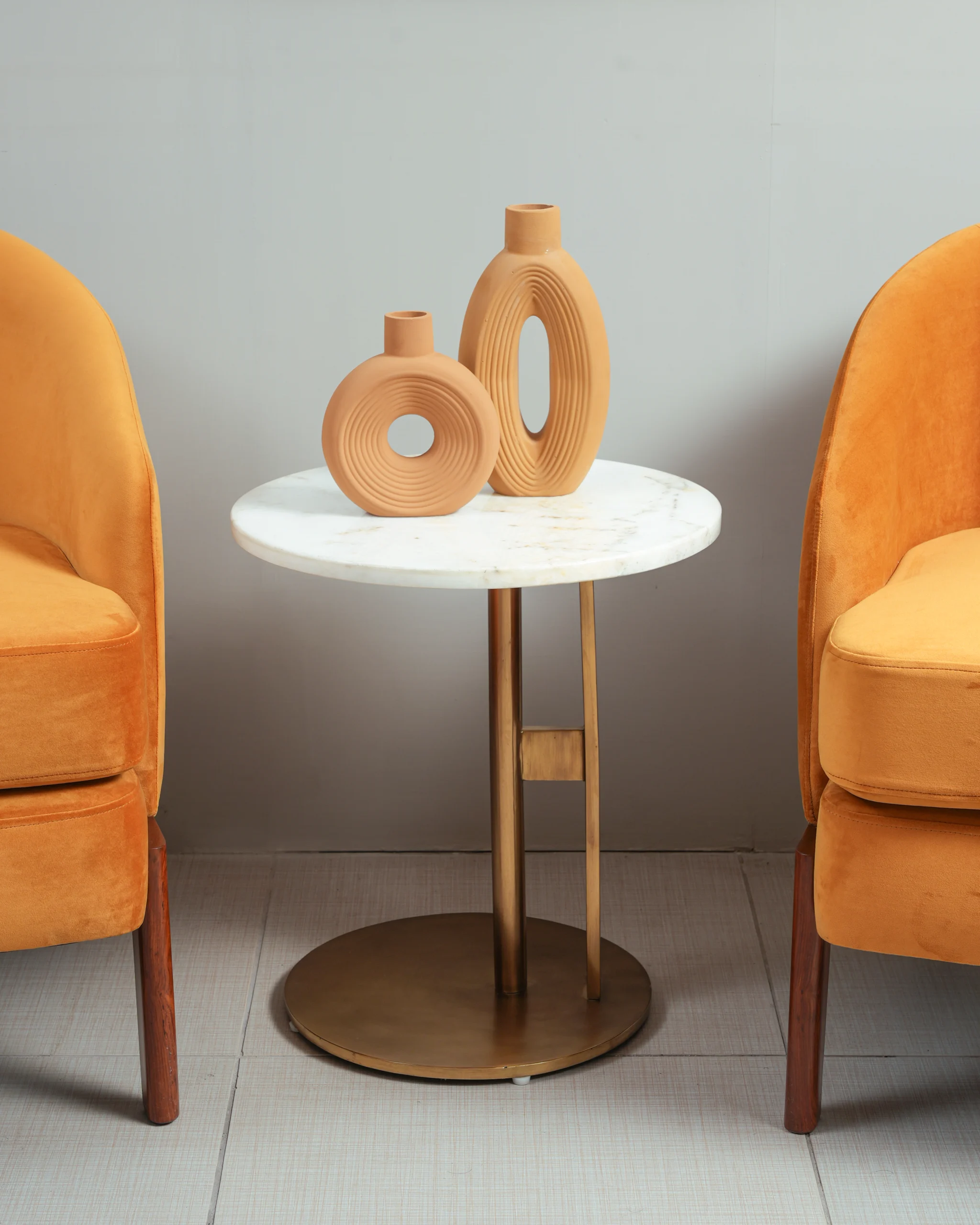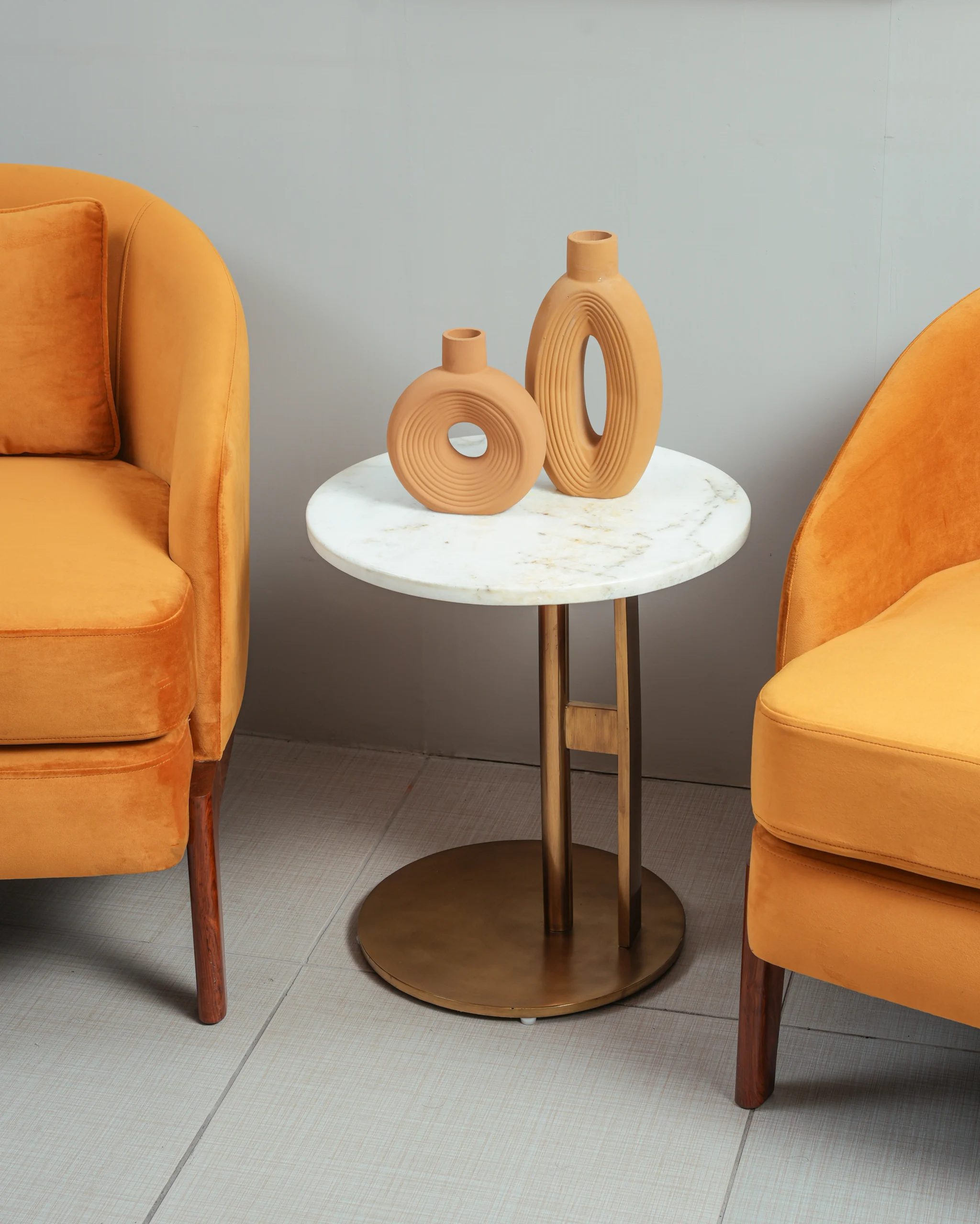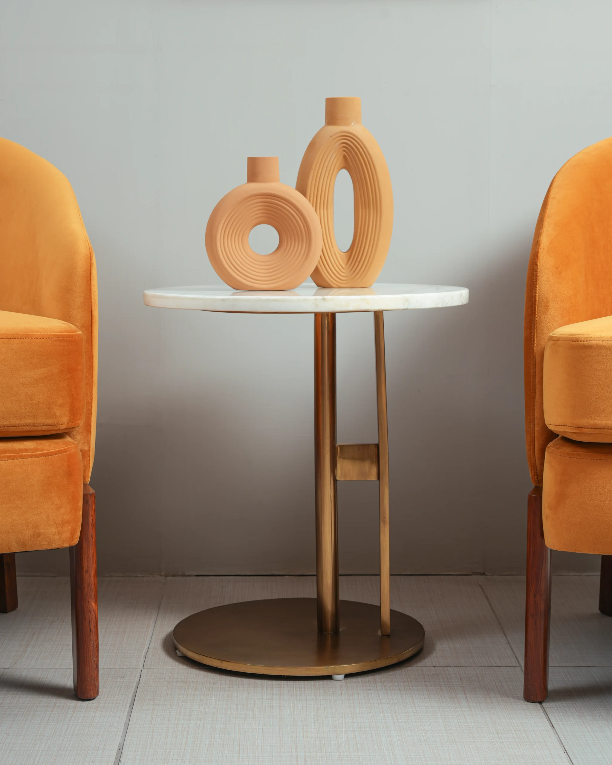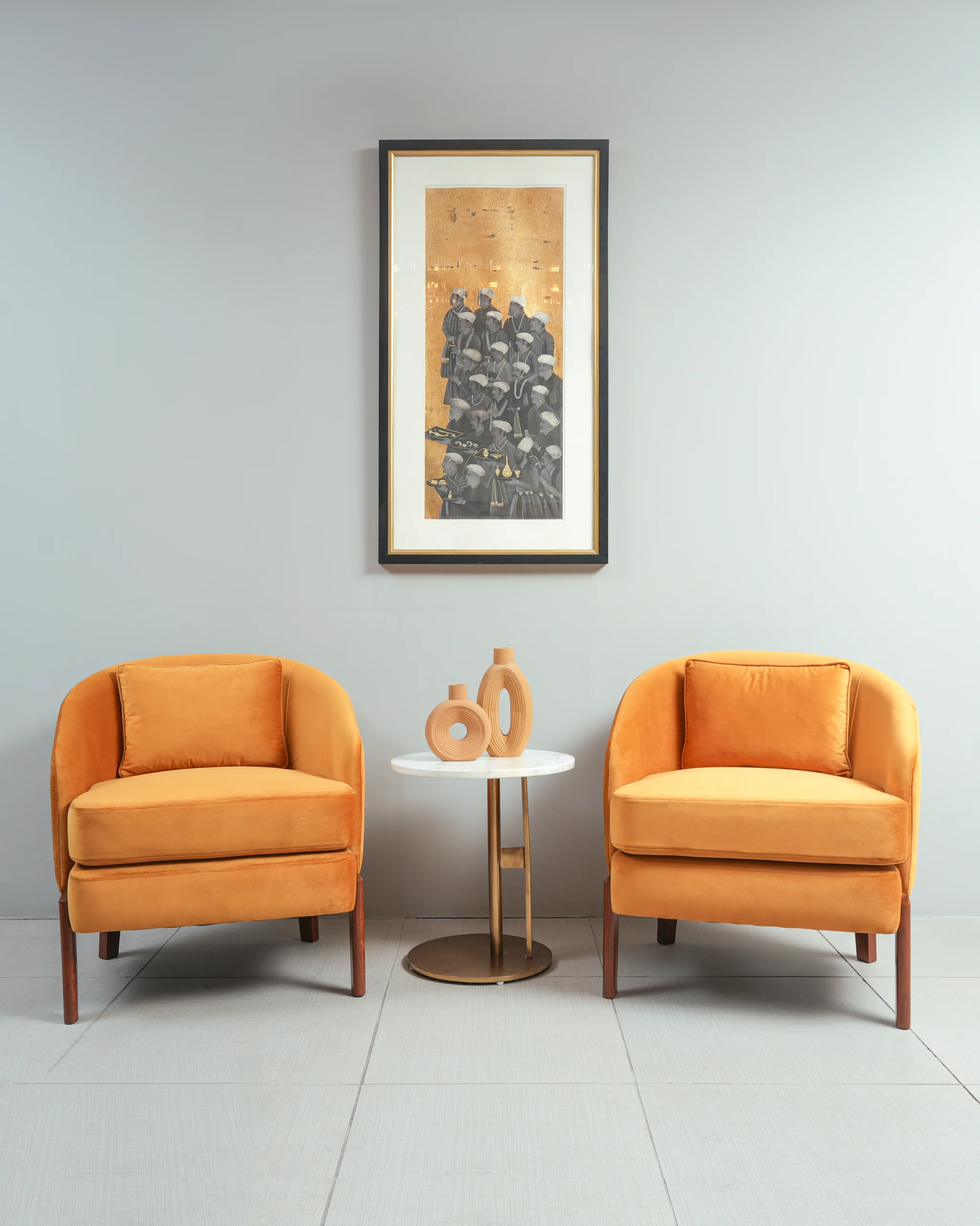 Lustrous Velvet Upholstery: The chair is upholstered in a soft, durable orange (or terracotta) velvet fabric that offers a luxurious tactile experience and a subtle sheen that shifts with the light.