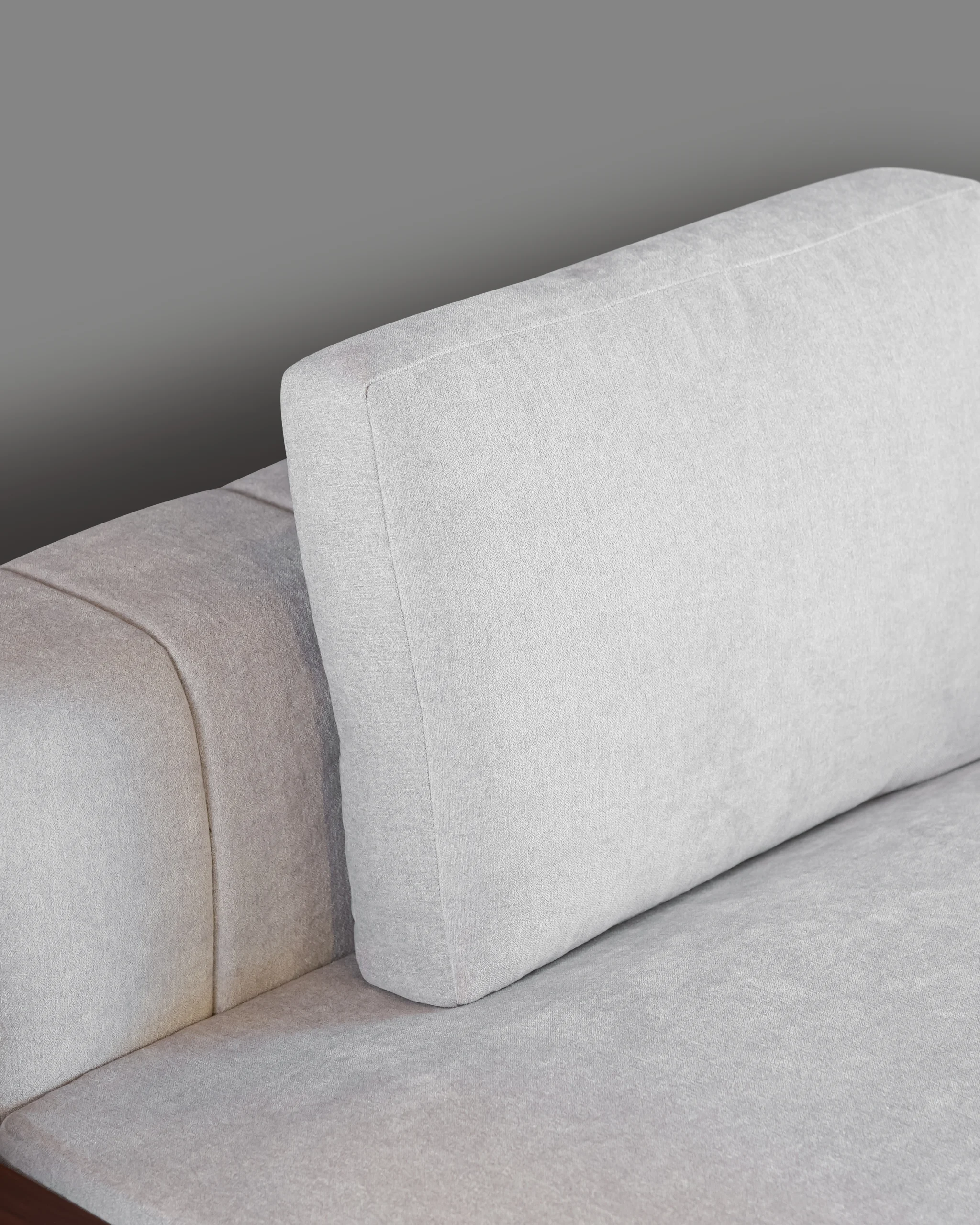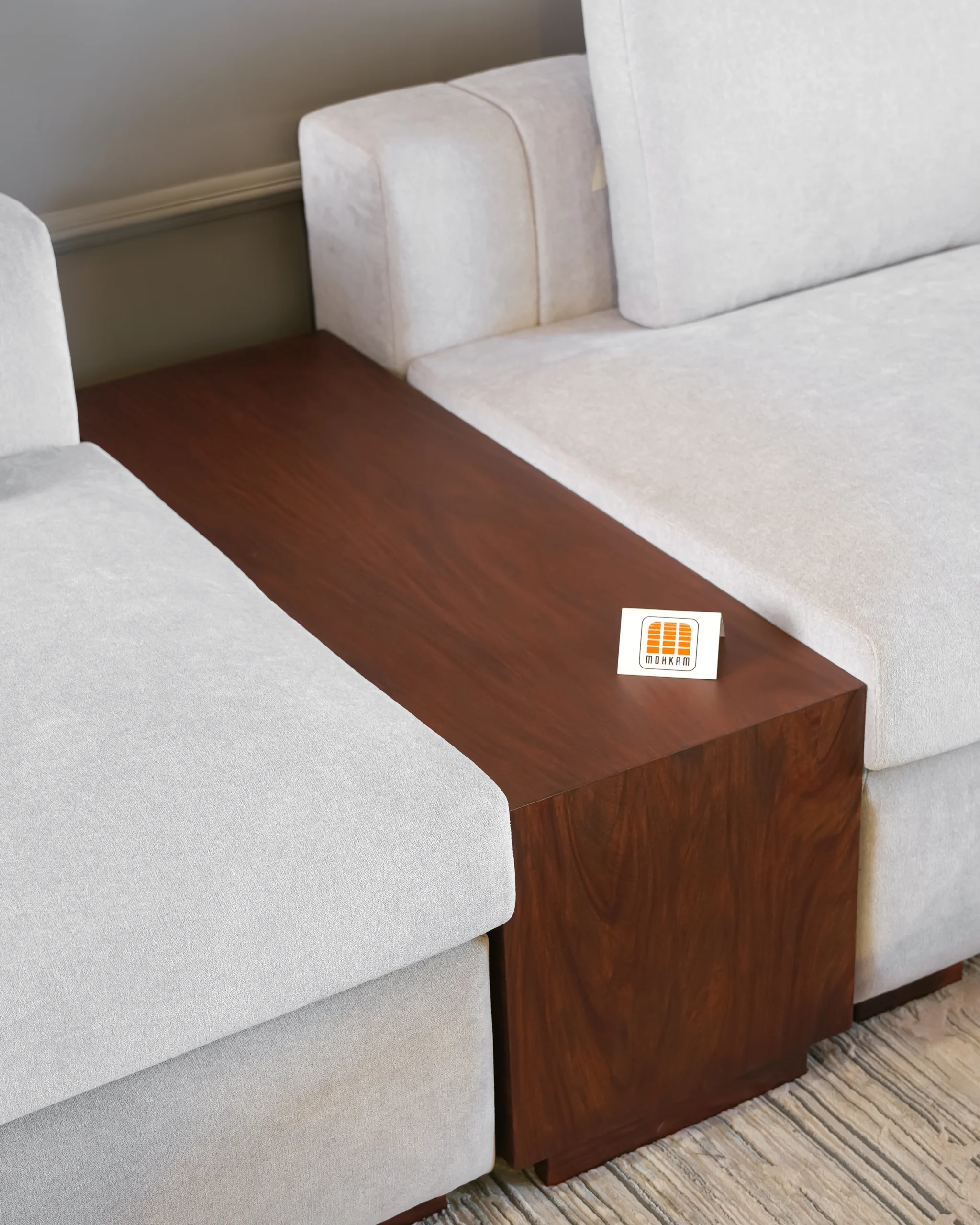 Built-in Wooden Side Table: Integrated dark wood end platform adds functionality and contrast to the sofa’s sleek design.