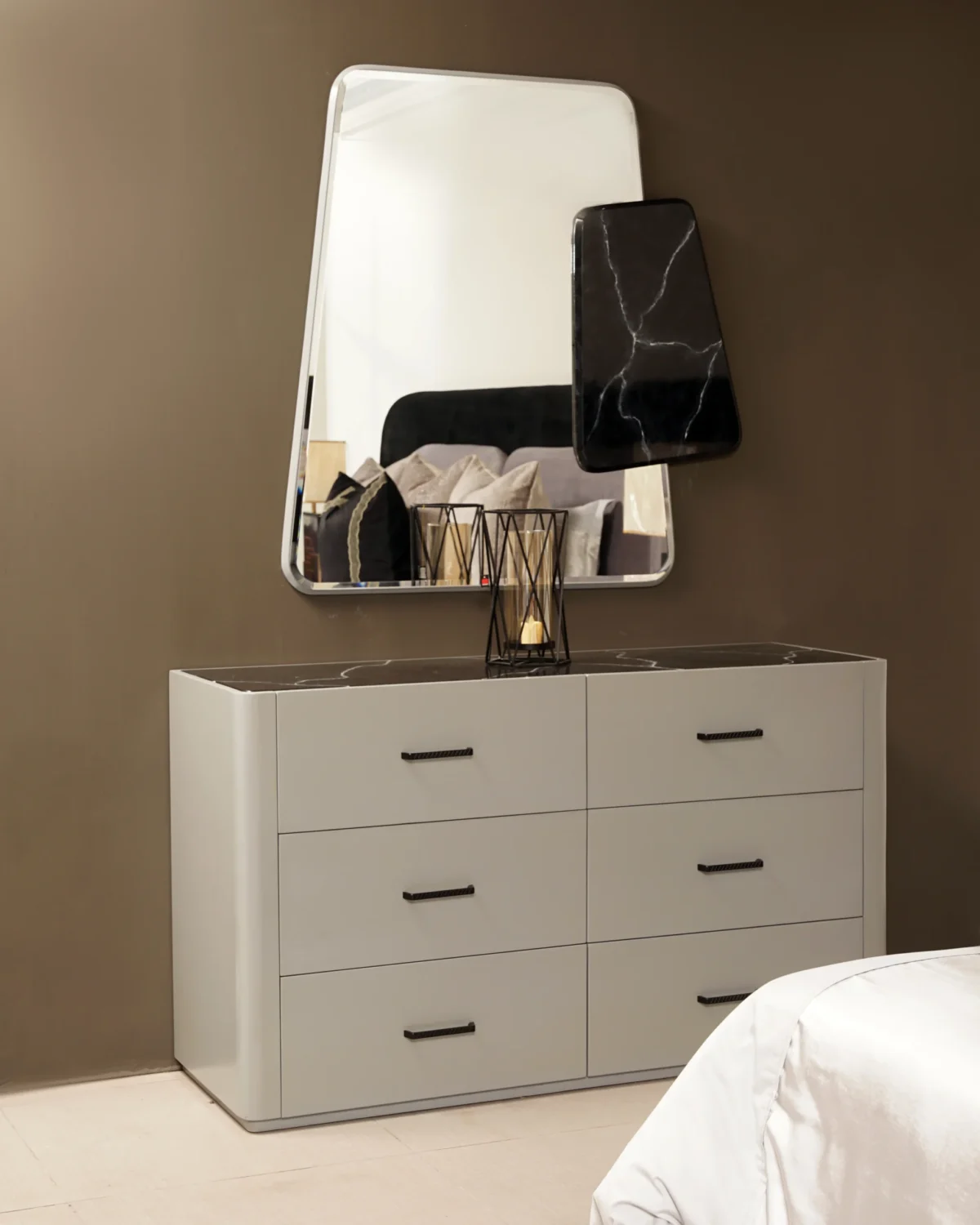 Introduce modern sophistication to your room with this 6-drawer dresser featuring a premium black marble effect top and matte grey lacquered body. The dresser is paired with an asymmetrical designer mirror, adding a bold and artistic statement to your interior. The sleek black handles ensure a clean and minimal aesthetic, while the generous drawer space provides practical storage for clothing, accessories, and more.