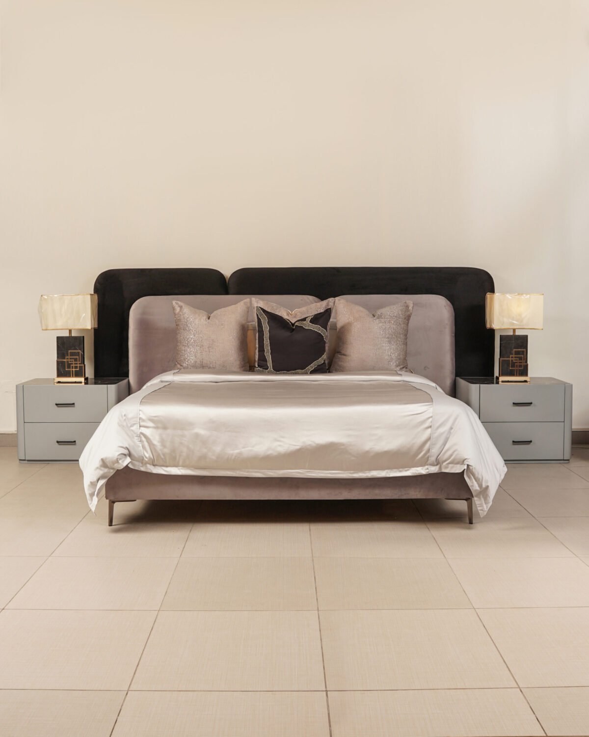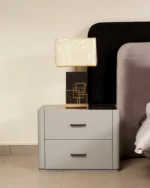 Minimalist in form yet rich in finish, these 2-drawer bedside tables are a stylish complement to any modern bed. With a black marble effect top and smooth grey body, each piece brings both beauty and practicality to your bedside. Accented with matching sleek black handles, they offer ample space for nighttime essentials while maintaining a clean, cohesive look.