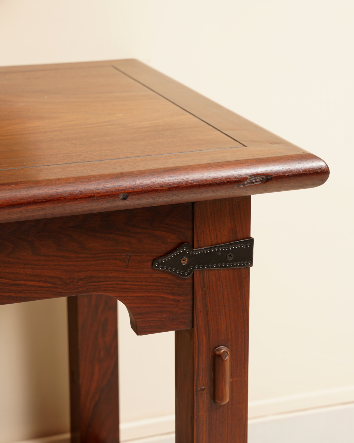 The writing table features a spacious tabletop and a central drawer with a carved wooden pull—perfect for storing stationery, documents, or daily essentials while keeping your workspace tidy. Sturdy iron brackets add a vintage industrial touch and reinforce the table’s robust construction.